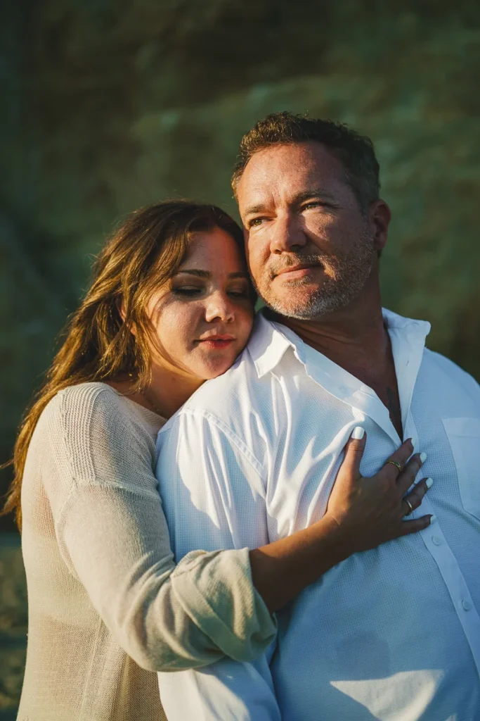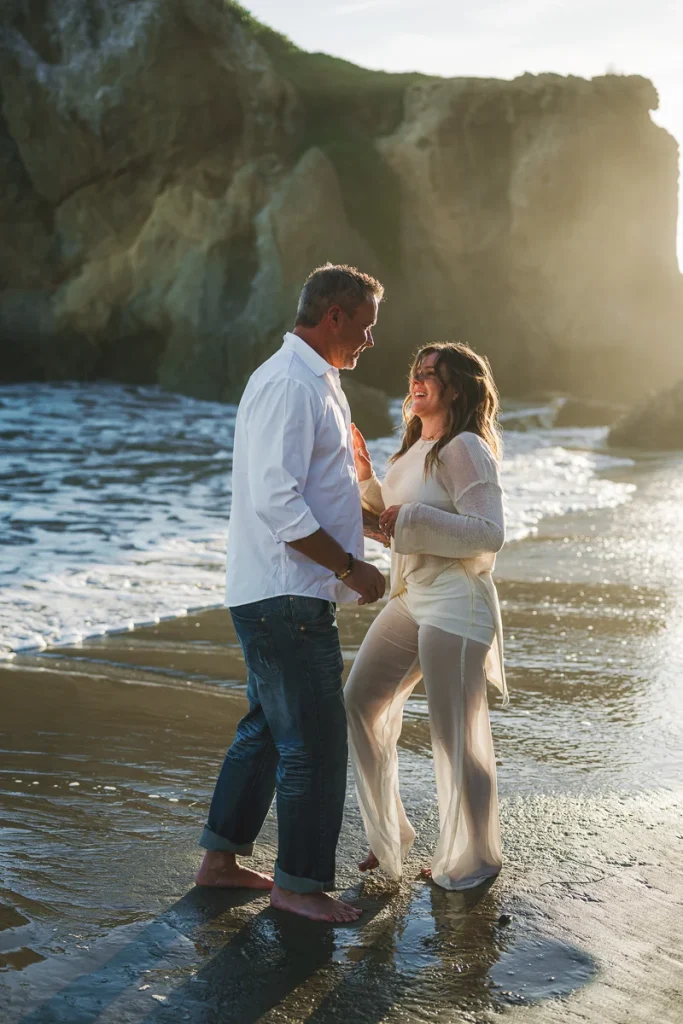For Brittany and Todd’s session, we captured a mix of wide ocean views and closer moments framed by the textured stone. The golden hour light brought warmth and softness to the scene, making the waves and cliffs glow. From walking along the shoreline to exploring the sea-carved alcoves, every part of the beach gave us something unique to work with.